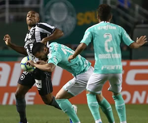 A resposta do Verdão não demorou muito, mas foi sem perigo: aos 8 minutos Bruno Henrique soltou a bomba, por cima do travessão. Aos 12 foi a vez de Scarpa arriscar de fora da área, mas também errou o alvo. Dois minutos depois uma jogada improvável: o Botafogo marcou todo ataque alviverde, deixando Thiago Santos livre; o volante foi carregando a bola, tabelou com Scarpa, invadiu a área e tocou na saída de Diego Cacalieri: 1 a 0.