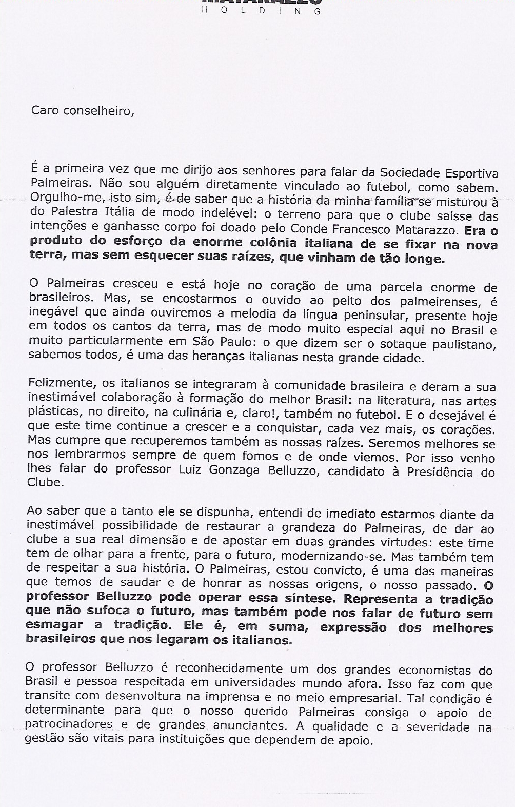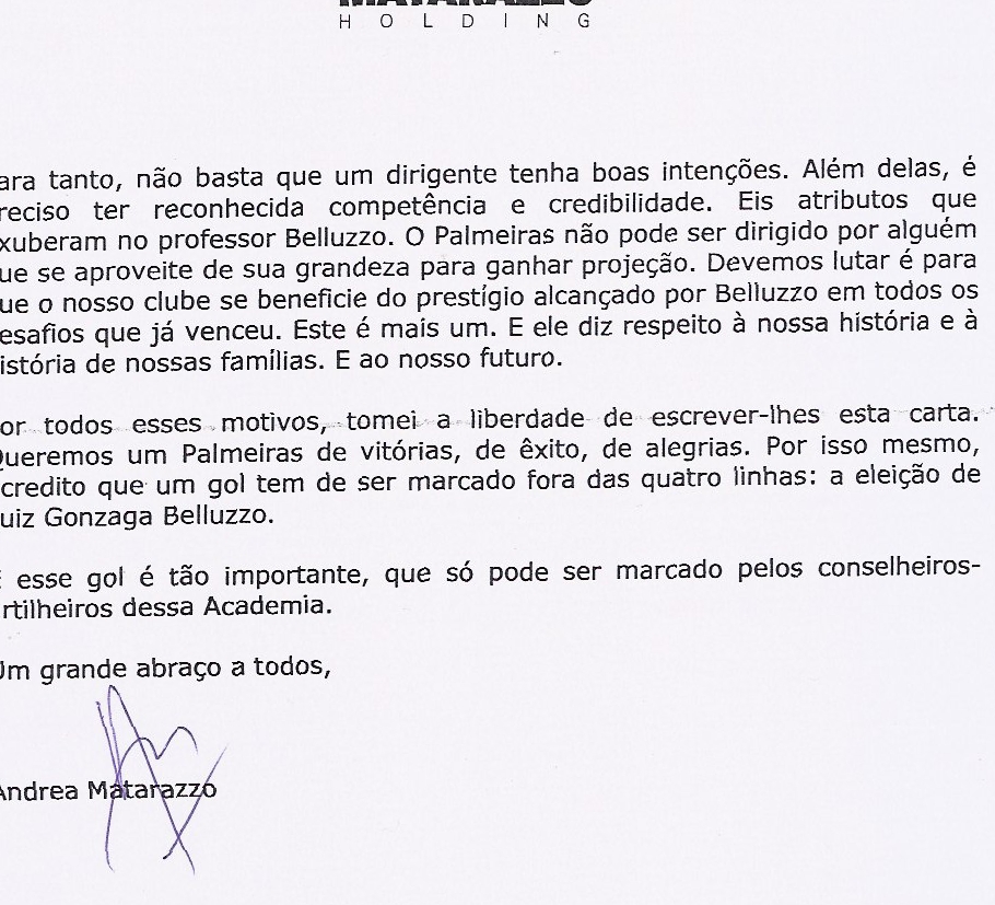 Andrea Matarazzo, Secretário Municipal das Subprefeituras de São Paulo, manifestou apoio ao candidato Luiz Gonzaga Belluzzo ao escrever uma carta aos conselheiros do clube.